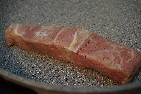 從鍋裡把牛小排取出後,經由時間的淬煉下,可以看到已變為非常漂亮的粉嫩色了,就連肉汁都完全保留於袋內不流失。這種熟度的牛排其實是可以吃的,只是表面與想像中的有一段落差,所以還需要進行一個加工的過程才算大功告成。