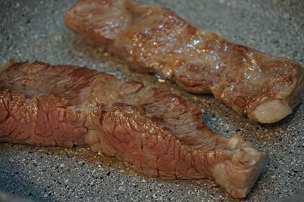 完全將牛排表面的汁液擦拭完畢後,再放到已經加熱過一段時間的鍋子裡,正反兩面各煎30秒後就可以起鍋。
