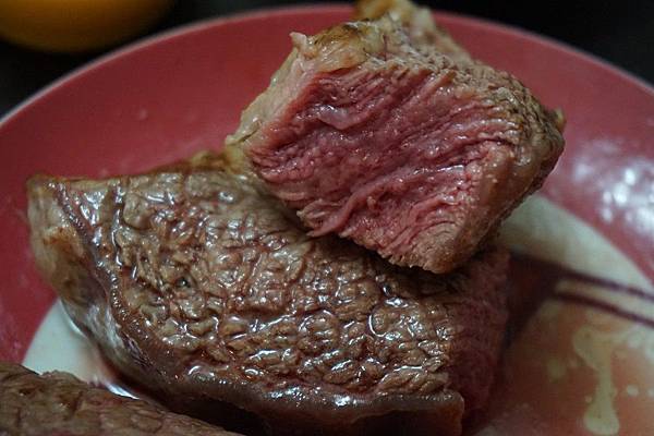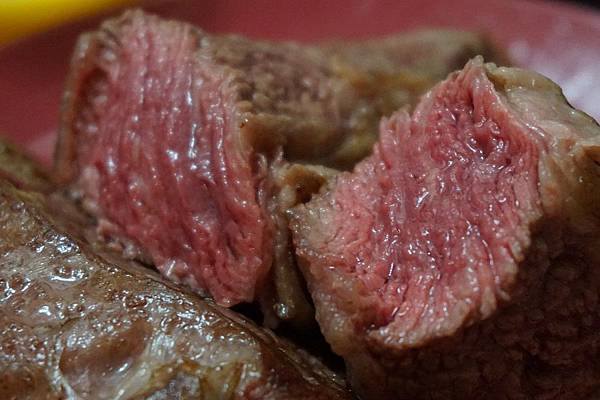 端上桌後立即用刀子切開來看,恩,很好切開的剖面呈多汁的粉紅色,就連肉汁都被完全鎖在裡面,連調味料都不用沾就充滿著濃郁的肉味。