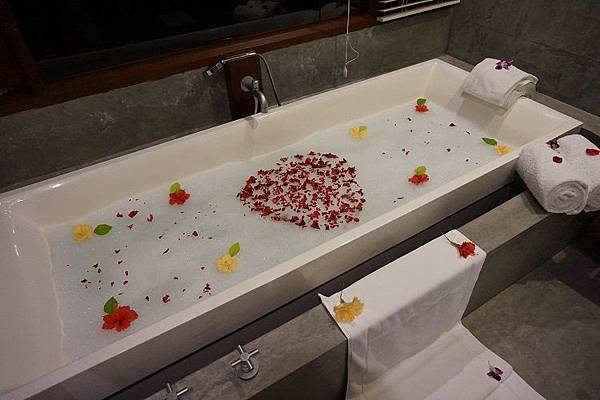 說完這番話後就要我們跟著他去浴室,原來是他靠著自己的創意和巧手精心佈置了花瓣浴。![]()
