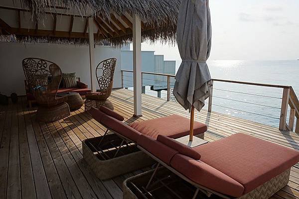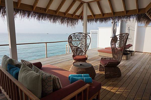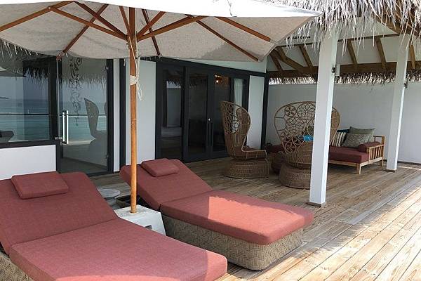 Seaside Finolhu(Finolhu Baa Atoll) 水上別墅的戶外露台空間,因為沒有私人泳池的緣故,即使已經放上不少椅子、沙發與躺椅,依舊顯得非常寬敞,對於一間房只住兩個人來說,簡直可以用奢侈來形容。