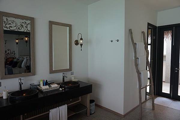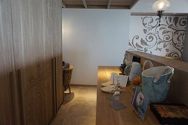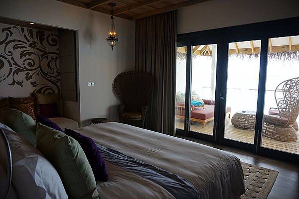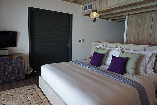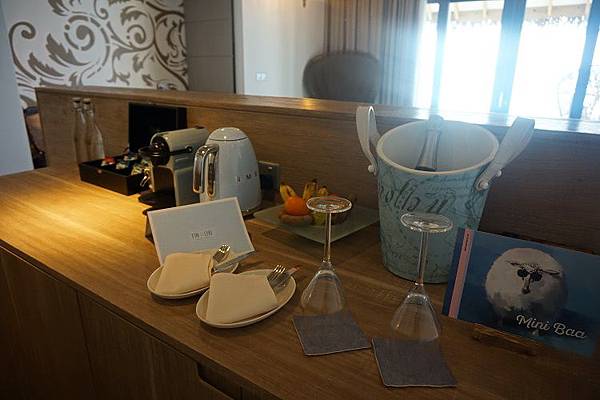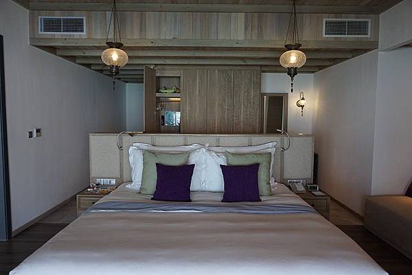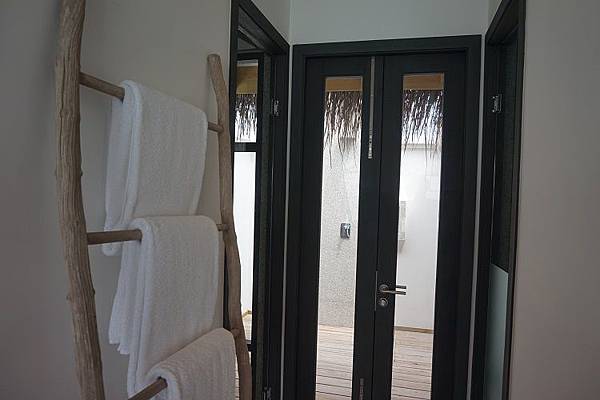 這次選擇的水上屋房型是Lagoon Villa,也就是沒有泳池的潟湖別墅,打開房門後,除了充斥著一股新房間剛完工後的味道,一轉身就能看到 Mini Bar放了不少東西,與它正對的就是衣櫃。