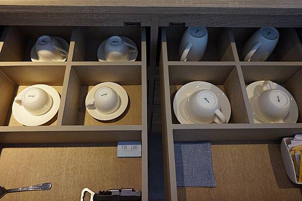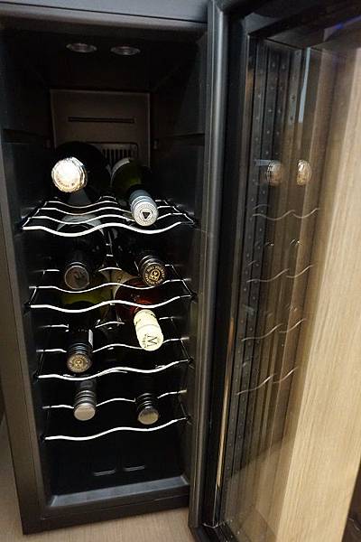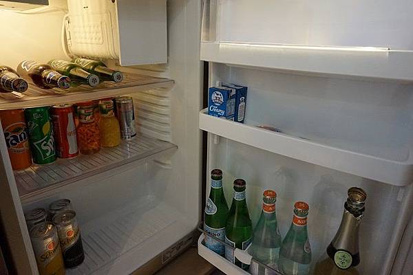桌面下方還放有餐飲用具,不可或缺的當然還有酒精與無酒精飲料,照一般的飯店慣例這些放在冰箱裡的當然都是要額外收費的。