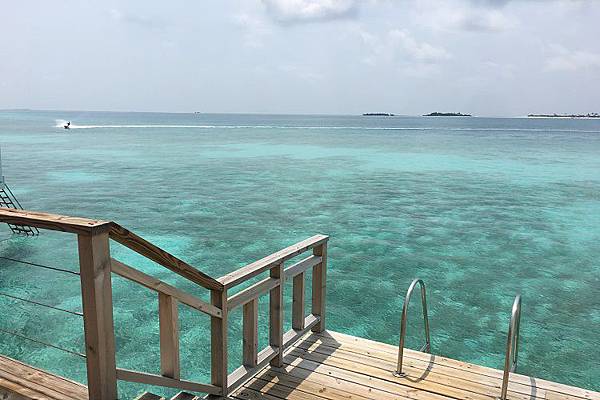 水上屋的木棧道旁也規劃有階梯能直接走進海裡,不曉得這是否為針對住在沙灘屋的旅客的設計,如果不是自己住在水上屋別墅區,看到這個一定會很興奮。