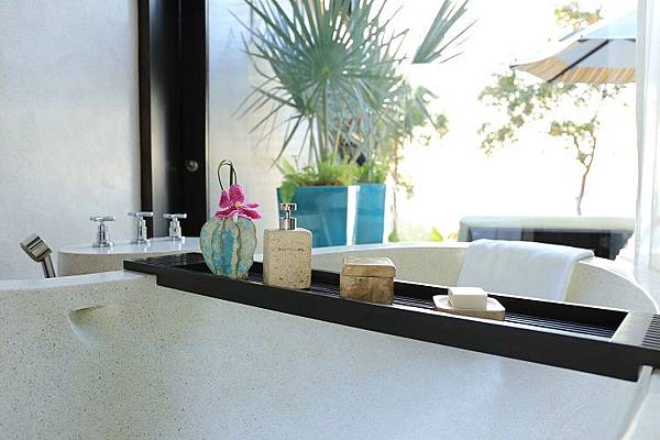 除了最基本的淋浴空間,當然還有像蛋型一般的浴缸可以泡澡,浴缸架也備有沐浴乳、泡澡浴鹽與香皂,再加上可以透過旁邊的落地大玻璃欣賞戶外景致,真的是再享受不過。