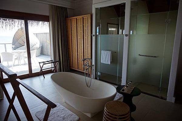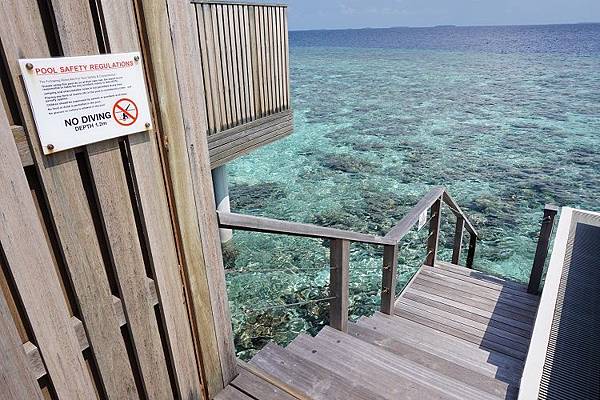 最後也來稍微介紹一下文章前面提到的 Water Villa with Pool,雖然名為水上屋,但是與 Ocean Water Villa with Pool 的方位完全不一樣,位在島的另一側。從圖片上來看就曉得設立的位置距離沙灘較近,大約在海水與岸邊的交界處,除此以外,最大的不同點就屬從這裡下水浮潛距離珊瑚斷層區域極為接近。